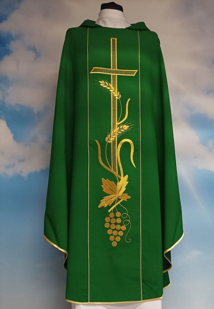 Priest's Green Chasuble with Embroidered Gold Cross Design.