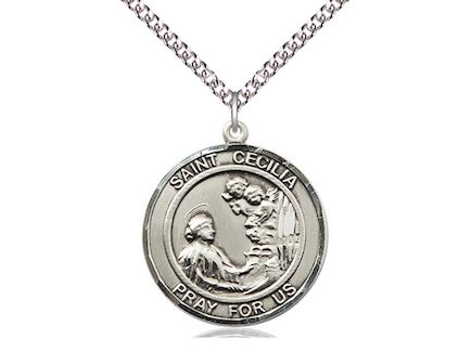 Sterling Silver Saint Cecilia Medal With Sterling Silver Curb Chain.